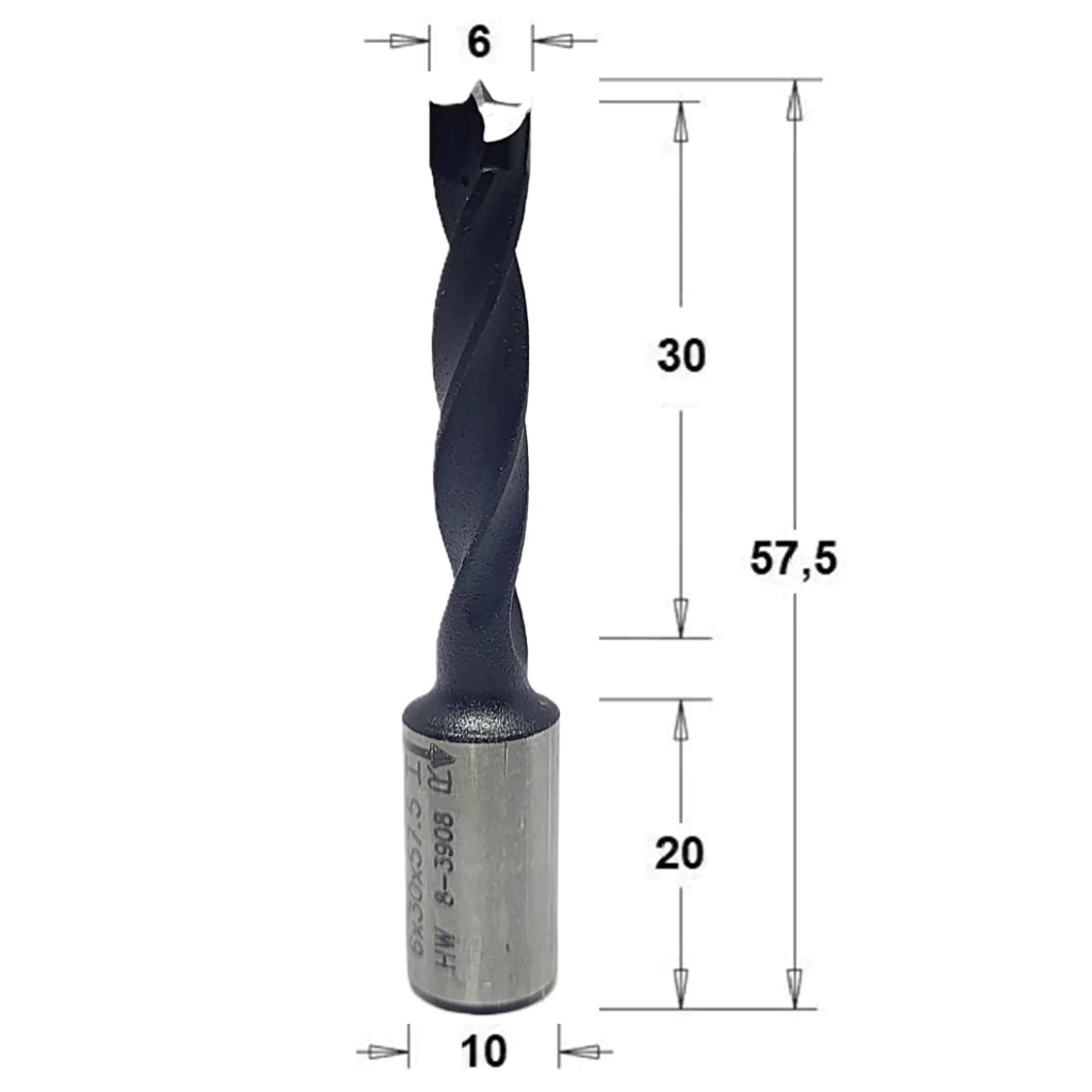 Broca HW Não-passante, diâmetro de corte de 6mm, comprimento total de 57,5mm, com Rotação Direita. Produzida com matérias-primas de alta qualidade a fresa italiana, marca CMT, apresenta alto desempenho e rendimento.